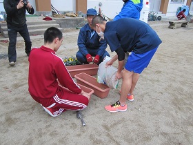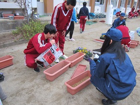 の一年生が田島中学校に赴き、中学生にプランターへの