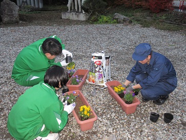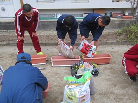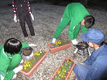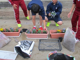 授業で、荒海中学校に赴きプランターへの定植を行ってま