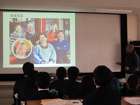 日頃の暮らしの中でその仕組みを考えることの少ない経済分野を、「ハンバーガーの価格と野菜の価格」という分かりやすいテーマ設定で解説していただきました。そして、モノの価格は需要と供給のバランスで決定する、価格と決定する要因の一つにはメニューコストがある、ことを学びました。この講演を聞いて、経済に興味を持ったという感想を述べる生徒もいるなど実り多い講演会となりました。