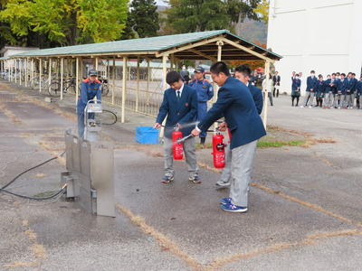 10月31日(火)、今年度2回目の避難訓練を実施しました。本校では、春季(第1回)が地震、秋季(第2回)が火災を想定した訓練をしており、今回は校内から出火したと仮定して避難訓練を行いました。サイレンと緊急放送が流れると、生徒全員が校舎外にスムーズに避難できました。校長と消防署員の講評後には、生徒代表による消火訓練も実施し、約30分の訓練は終了しました。