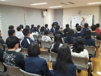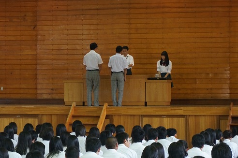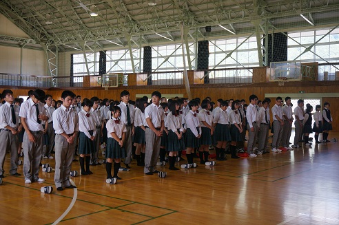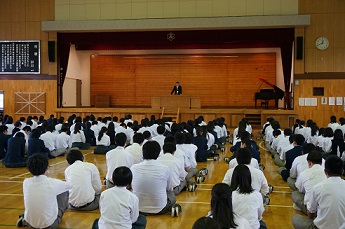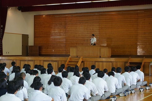 その後、全校集会が開かれ、校長先生や生徒指導部の先生からお話をいただきました。