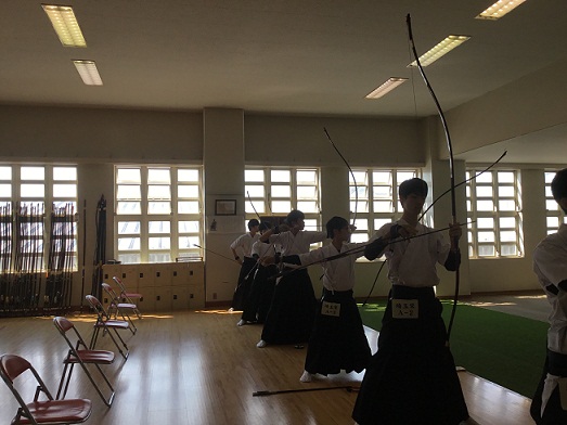 前橋商業高校は28年度の全国選抜・東日本大会出場の実力校です。今回はじめて学校にお邪魔させていただきました。校舎は七階建て、立派なサッカー場や屋内プールがあり、伝統校を感じさせられます。弓道場も顧問の先生の手によるリフレッシュが施されており、広さはないもののしっかりと整理整頓されており見習うべき点が沢山ありました。午後の女子の5人立ちの戦いは引き分けでした。