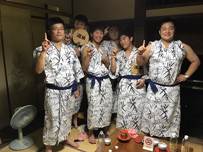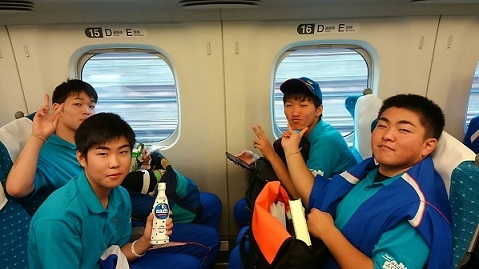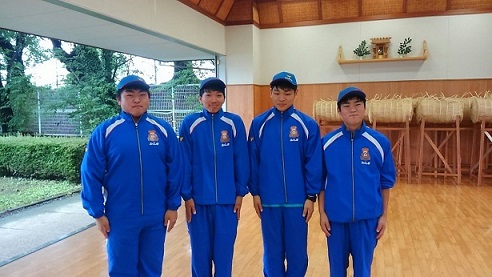 左:参加選手は左から鈴木陽太郎(白河3年)、山口誠人(平工業2年)、中宿元太(白河3年)、蛭田元樹(勿来工業2年)、監督に私杉田一馬(田島)、コーチに草野智教(磐城)です。青いジャージは福島県ジャージです。少年探偵団と名付けました(笑)