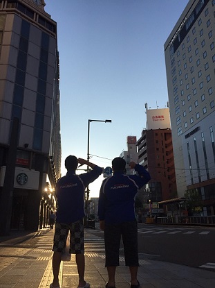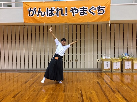 右:山口県の旗の前で喜ぶ山口選手です。(笑)
