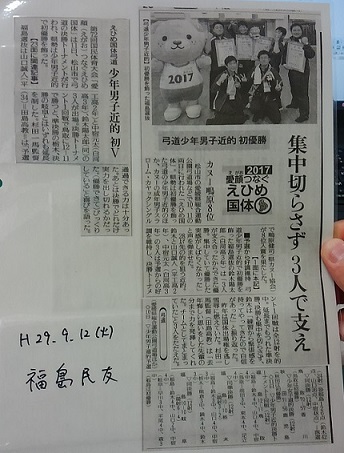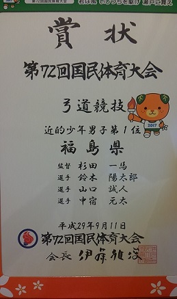 9月6日(水)~12日(火)まで「愛顔(えがお)つなぐえひめ国体」に顧問杉田が福島県少年男子監督として出場してきました。弓道は早期開催競技であり、2年前の和歌山国体以来二回目の出場です。