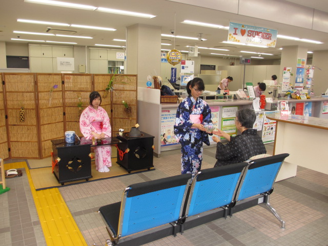 本日(7月23日)茶道部は祇園祭に合わせて、田島郵便局内でチャリティ茶会を行っております。