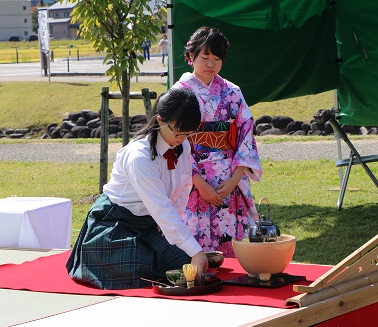 10月9日(月)・体育の日、お蔵入り交流館で実施された新そばまつりの会場で、本校茶道部が野点を行いました。当日は天候にも恵まれて大勢の皆様にお出でいただき、午後3時頃には用意した分が全てなくなってしまうほどの盛況ぶりでした。7名の生徒達は日頃の練習の成果を発揮し、お客様からは「気配り・心遣いが素晴らしい」というお褒めの言葉をいただくことができました。なお、2年生3名は恒例の着物姿となりました。