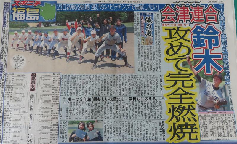 7月3日(金)のスポーツニッポンの裏一面で本校野球部を含む会津連合の記事が掲載されました。本校のマネージャーも取り上げられるなど、夏の開幕が近づいてきているのを実感しているところです。また、7月6日(月)の夕方からKFB福島放送のふくしまスーパーJチャンネルにて会津連合の特集が放映されることが決まりました。夕方18時15分以降の放映となりますので、多くの方にご視聴いただければ幸いです。
