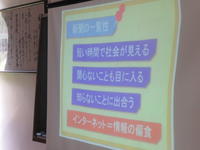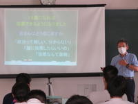 日頃の暮らしの中でその仕組みを考えることの少ない経済分野を、「ハンバーガーの価格と野菜の価格」という分かりやすいテーマ設定で解説していただきました。そして、モノの価格は需要と供給のバランスで決定する、価格と決定する要因の一つにはメニューコストがある、ことを学びました。この講演を聞いて、経済に興味を持ったという感想を述べる生徒もいるなど実り多い講演会となりました。