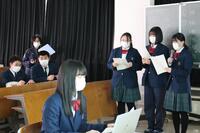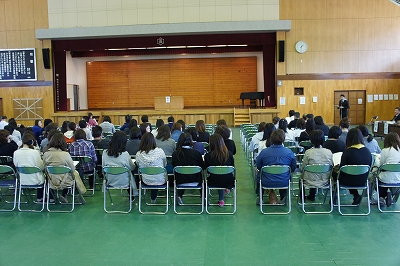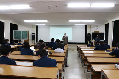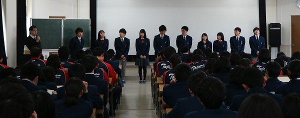 平成30年2月9日(金)、3年生の代表生徒による「進路体験発表会」が行われました。これは、進路を決定した3年生が進路実現に向けてどのように取り組んできたのかを、1・2年生に向けて発表するものです。大学・短大・専門学校合格者、公務員試験合格者、就職内定者の計10名が、「試験の内容」、「試験に向けての準備」、「当日の感想」、「高校生活で頑張ってきたこと」、「後輩へのアドバイス」などについて、熱く語ってくれました。1・2年生にとって大変有意義な情報ばかりで、刺激になったと思います。