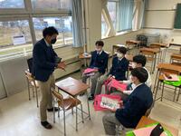 12月15日(火)、3年生生徒を対象に「スーツ着こなし講座」を行いました。紳士服専門店コナカ会津若松店の店長嶋田様を講師にお招きし、場面に応じたスーツの着方や選び方などについてお話をしていただきました。男女1名代表の生徒には写真のようにスーツを着てもらい、着こなし方のポイントをわかりやすく説明していただきました。生徒たちは、モデルの生徒を見ながら入社式などの服装を想像していた様子でした。