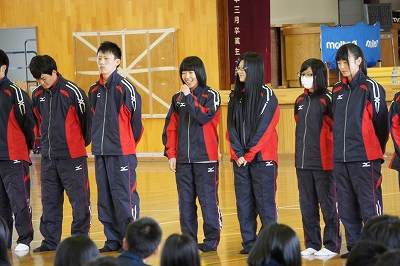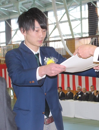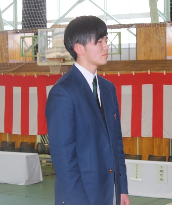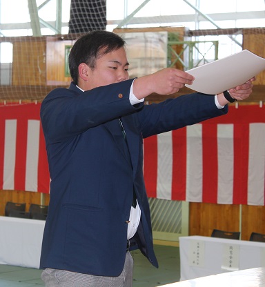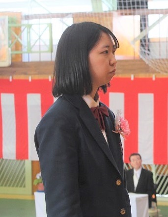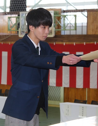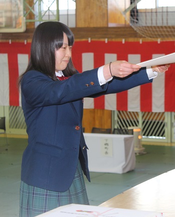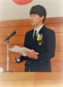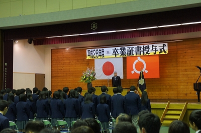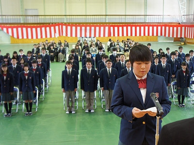 式では、一人ひとりの名前を担任の加藤竹志先生、杉田一馬先生、岸孝容先生が読み上げ、大竹礼乃さん、渡部雅也くん、君島直樹くんの3名がクラスを代表して卒業証書を受け取りました。次に湯田重哉校長の式辞が読み上げられ、さらに星學下郷町町長、湯田良一同窓会会長、猪股淳父母と教師の会会長より祝辞を頂きました。その後、星拓海くんが在校生代表送辞を、栗城斗真くんが卒業生代表答辞を行いました。最後には、校歌と式歌「蛍の光」が斉唱され、約1時間の式は感動のうちにラストを迎えました。