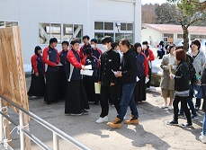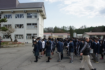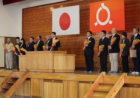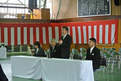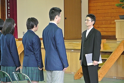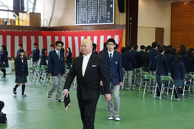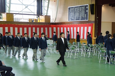 平成29年度末の人事異動で、本校では3名の先生方が定年退職となり、11名の先生方が異動または退職となりました。式では、離任される先生方お一人おひとりから、田島高校での思い出や田島高校生に対するアドバイスなどが熱く語られました。最後に生徒会から花束が贈られ、その後離任される先生方は生徒達に見送られました。