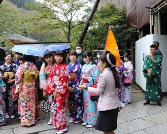 3日目は、まず全員で着物をレンタルし、着付けした後に清水寺を見学しました。あいにく小雨が降る天候でしたが、大変いい思い出になったと思います。その後、二条城を見学してから大阪に移動し、なんばグランド花月の公演を鑑賞しました。さすがお笑いの本場であり、大爆笑の連続で気分も高まりました。