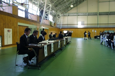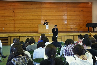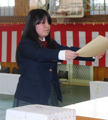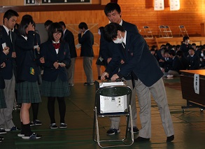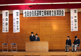 校長と選挙管理委員長の挨拶の後、会長・副会長立候補者及び応援者による演説が行われました。それぞれが当選したら実行したいことを真剣に訴え、一般の生徒達はその内容に耳を傾けていました。なお、立候補者は定員どおりの人数のため、信任投票となりました。