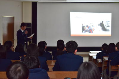 日頃の暮らしの中でその仕組みを考えることの少ない経済分野を、「ハンバーガーの価格と野菜の価格」という分かりやすいテーマ設定で解説していただきました。そして、モノの価格は需要と供給のバランスで決定する、価格と決定する要因の一つにはメニューコストがある、ことを学びました。この講演を聞いて、経済に興味を持ったという感想を述べる生徒もいるなど実り多い講演会となりました。